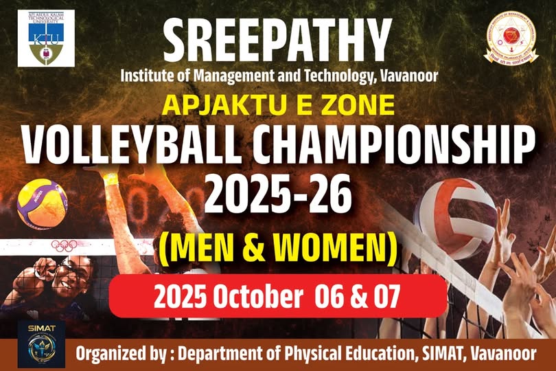 APJAKTU E ZONE VOLLEYBALL CHAMPIONSHIP 2025-26! 🏐🔥 On Oct 6 & 7 at Sreepathy Institute of Management and Technology, Vavanoor! Men & women teams gonna clash! 🏃♂️🏃♀️ Organized by the Department of Physical Education, SIMAT.